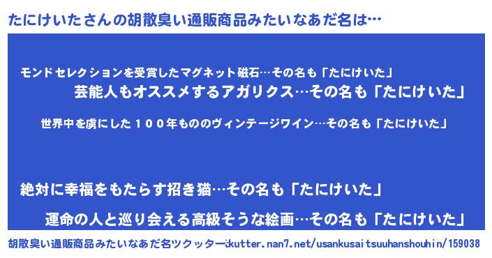 | 男性向けラノベタイトル風あだ名 | 『魔弾の王とたにけいた』 |
