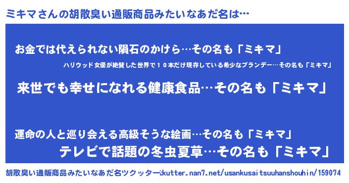 | 欧米人風あだ名 | 『アンジェラ・ミキマ』『ダニエルミキマ』 |
