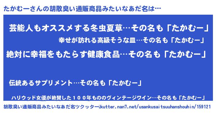 | 女子向けラノベタイトル風あだ名 | 『異世界で失敗しない100のたかむー』 |