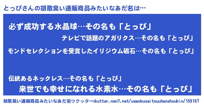 | ヒーロー風カッコイイあだ名 | 『慈愛の使者とっぴ』『スーパートッピ』 |