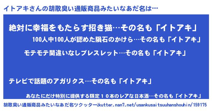 | 意味不明あだ名 | 『ペロリンイトアキ』『永久保存イトアキ』 |