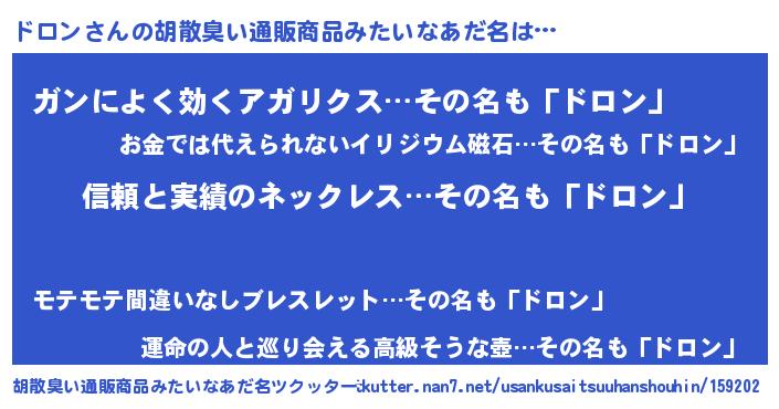 | 男性向けラノベタイトル風あだ名 | 『ダンジョンにドロンを求めるのは間違っているだろうか』 |