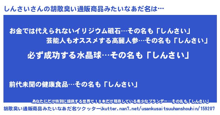 | 男性向けラノベタイトル風あだ名 | 『しんさいの憂鬱』『魔弾の王としんさい』 |