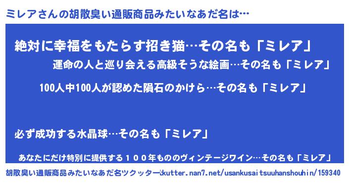 | ヘコむあだ名 | 『ミレア(遠い目)』『牛乳』『ミレを』 |