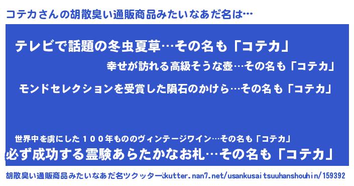 | 女子向けラノベタイトル風あだ名 | 『死神コテカの再婚』『闇のコテカ』 |