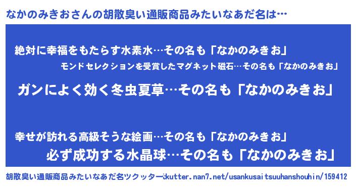 | 肩書あだ名 | 『なかのみきお総統』『なかのみきお店長』 |