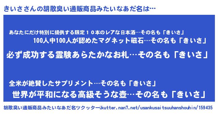 | 男性向けラノベタイトル風あだ名 | 『きいさの憂鬱』『魔弾の王ときいさ』 |