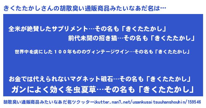 | 女子向けラノベタイトル風あだ名 | 『乙女ゲームの破滅フラグしかない悪役きくたたかしに転生してしまった…』 |