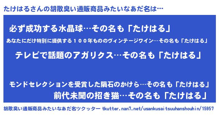 | ヘコむあだ名 | 『たけにゅー』『たけはる(笑)』 |