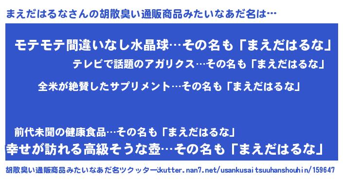 | 意味不明あだ名 | 『とにかく怪しいまえだはるな』 |