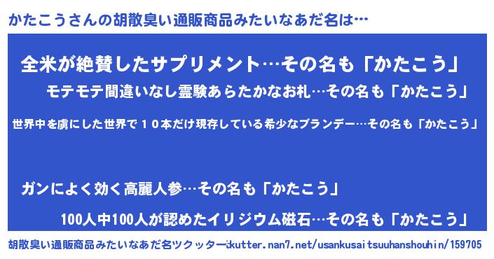 | 意味不明あだ名 | 『住所不定無職かたこう(77歳)』 |