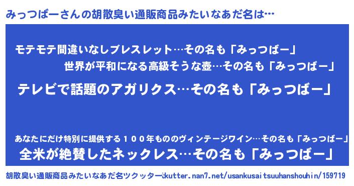 | 意味不明あだ名 | 『自称みっつばー』『ペロリンみっつばー』 |
