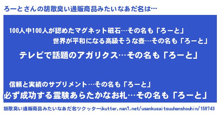 | 男性向けラノベタイトル風あだ名 | 『Re:ろーとから始める異世界生活』 |