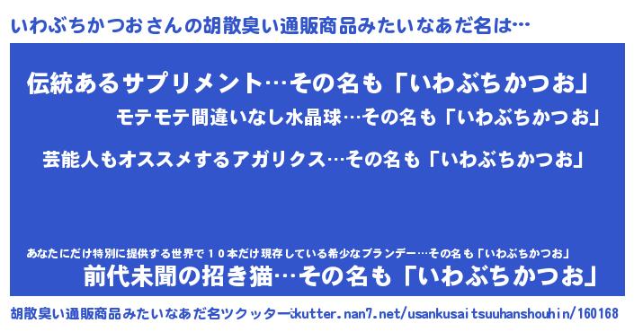 | 男性向けラノベタイトル風あだ名 | 『Re:いわぶちかつおから始める異世界生活』 |