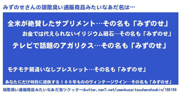 | 肩書あだ名 | 『みずのせ総統』『みずのせ団長』 |