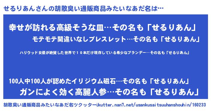 | 意味不明あだ名 | 『住所不定無職せるりあん(85歳)』 |