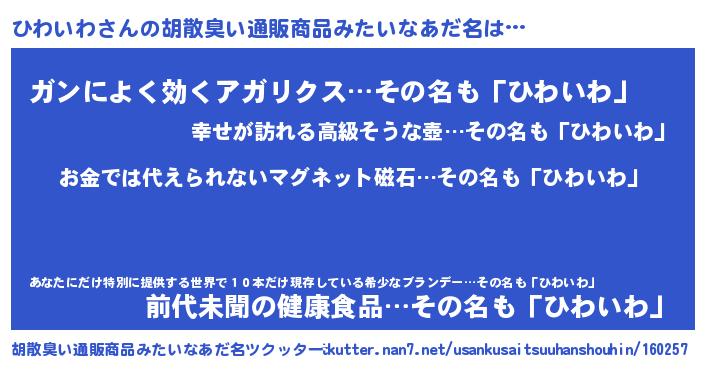 | ヘコむあだ名 | 『ひわいわ(笑)』『牛乳』『ひわを』 |