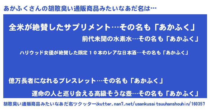 | 意味不明あだ名 | 『住所不定無職あかふく(56歳)』 |