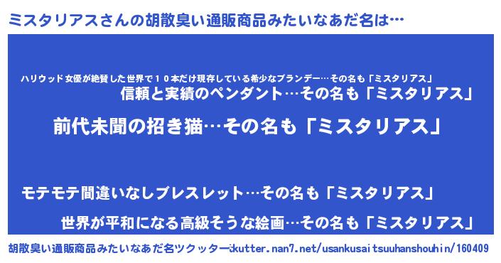 | 男性向けラノベタイトル風あだ名 | 『ミスタリアスに滅ぼされるだけの簡単なお仕事です』 |