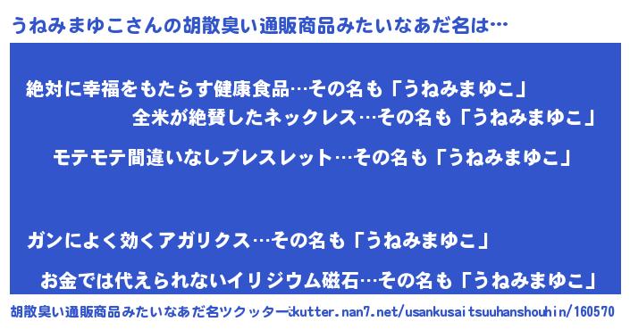 | 恥ずかしいあだ名 | 『プリティーうねみまゆこ』『うねちん』 |