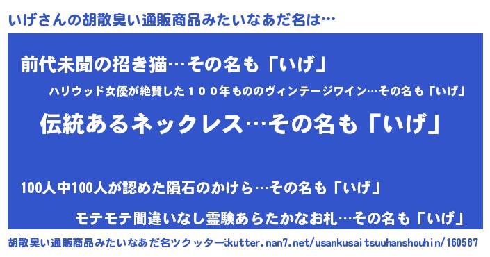 | 男性向けラノベタイトル風あだ名 | 『転生したらいげだった件』『いげの憂鬱』 |