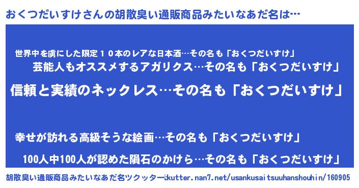 | 欧米人風あだ名 | 『ウサインおくつだいすけ』 |