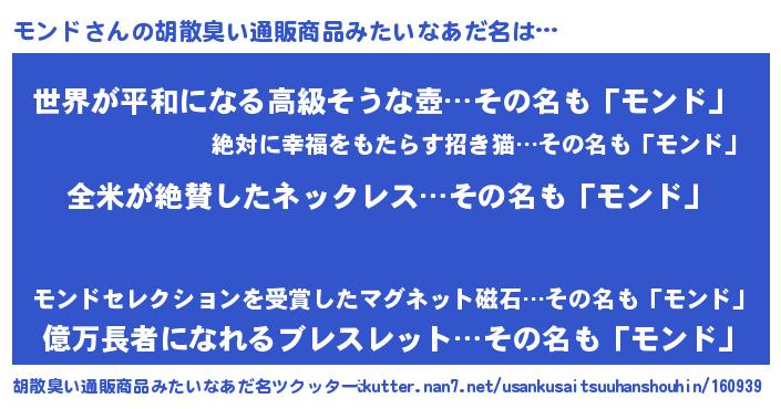 | 男性向けラノベタイトル風あだ名 | 『モンドの嫁は女の子じゃないと思った?』 |