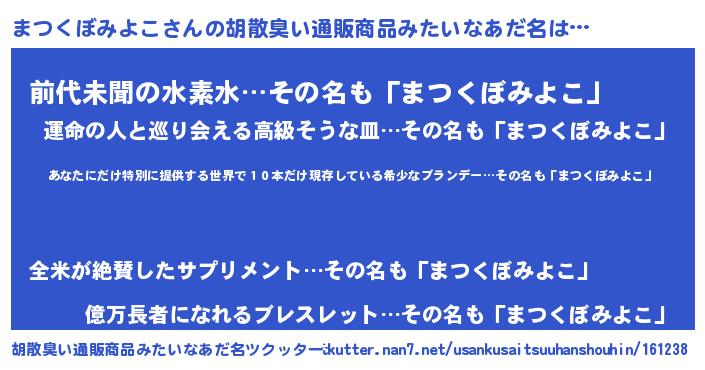 | 意味不明あだ名 | 『住所不定無職まつくぼみよこ(98歳)』 |