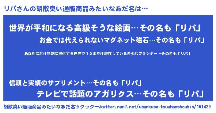 | 男性向けラノベタイトル風あだ名 | 『この素晴らしい世界にリパを!』 |