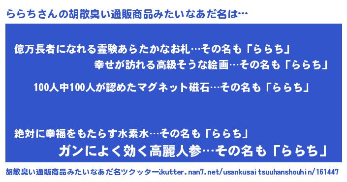 | 欧米人風あだ名 | 『アンジェラ・ららち』『ダニエルららち』 |