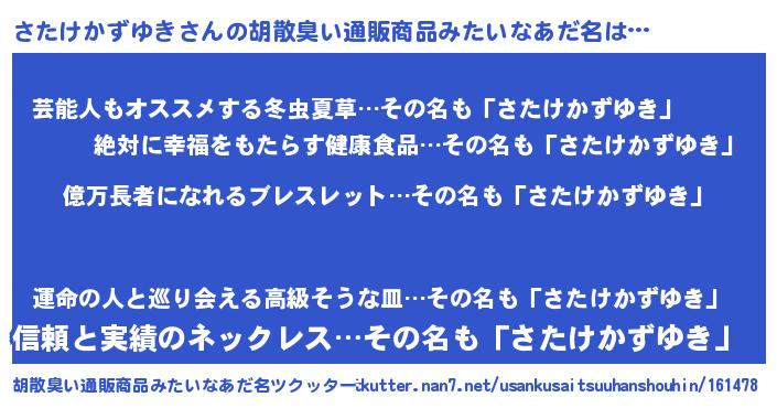 | 男性向けラノベタイトル風あだ名 | 『うちのさたけかずゆきが世界を掌握している!』 |