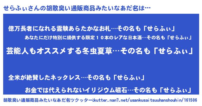 | 男性向けラノベタイトル風あだ名 | 『せらふぃに滅ぼされるだけの簡単なお仕事です』 |