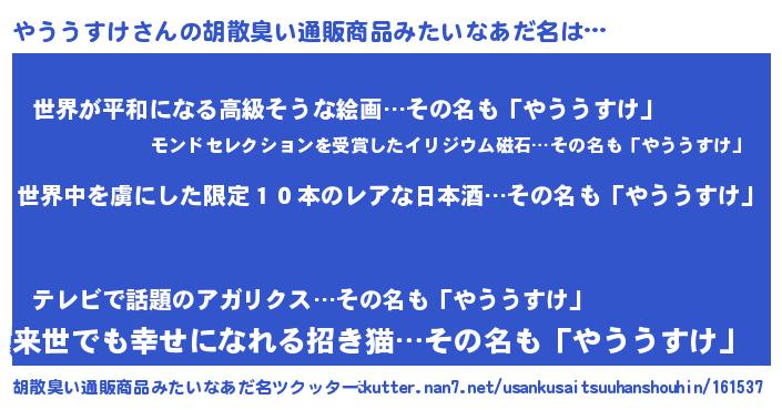 | 男性向けラノベタイトル風あだ名 | 『この素晴らしい世界にやううすけを!』 |
