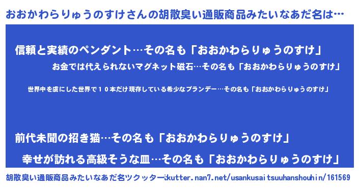 | 女子向けラノベタイトル風あだ名 | 『おおかわらりゅうのすけの玉の輿計画!』 |
