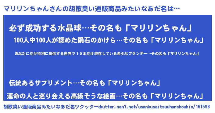 | 男性向けラノベタイトル風あだ名 | 『マリリンちゃん~年齢イコール彼女いない歴の魔法使い~』 |