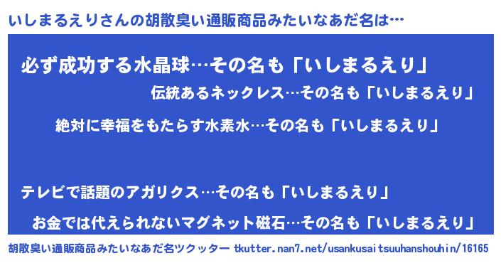 | ヘコむあだ名 | 『いしまるえり(震え声)』『いしもー』 |