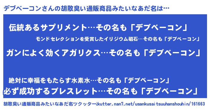 | 男性向けラノベタイトル風あだ名 | 『デブベーコンスレイヤー』 |