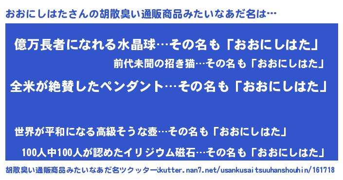 | 意味不明あだ名 | 『とにかく怪しいおおにしはた』 |