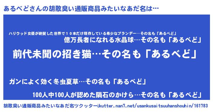 | 男性向けラノベタイトル風あだ名 | 『うちのあるべどが世界を掌握している!』 |