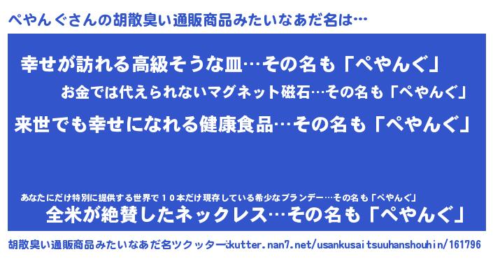 | 男性向けラノベタイトル風あだ名 | 『ぺやんぐという概念が存在しない退屈な世界 』 |
