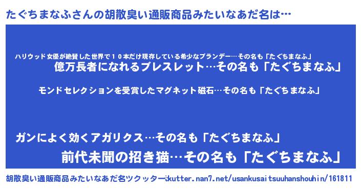 | ヘコむあだ名 | 『たぐちまなふ(笑)』『たぐもー』 |