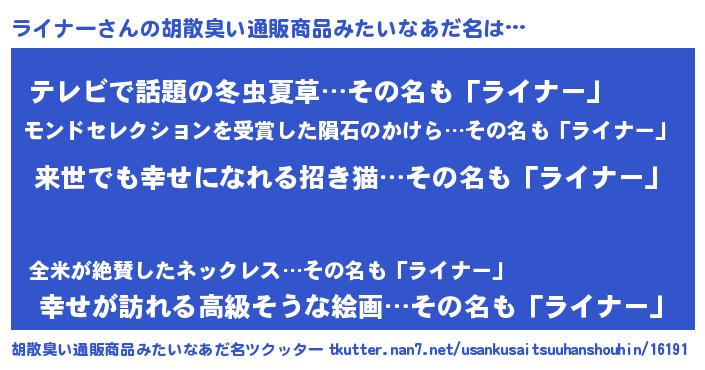 | ヘコむあだ名 | 『ライナー(小並感)』『豆乳』 |
