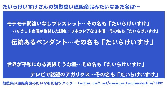 | 意味不明あだ名 | 『とにかく怪しいたいらけいすけ』 |