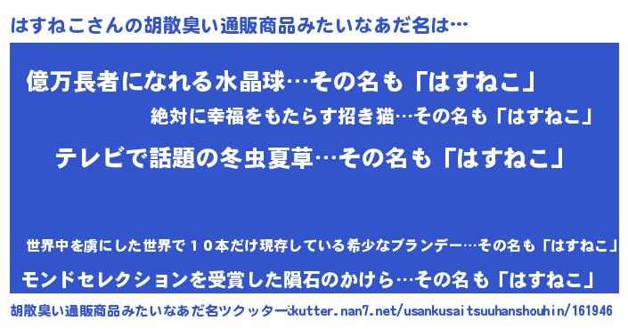 | 男性向けラノベタイトル風あだ名 | 『Re:はすねこから始める異世界生活』 |