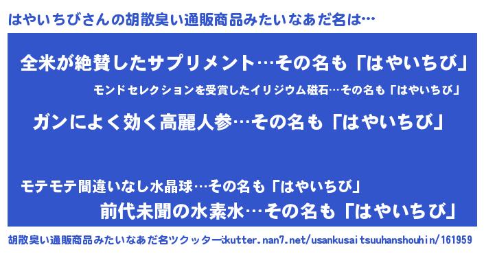 | 意味不明あだ名 | 『自称はやいちび』『永久保存はやいちび』 |