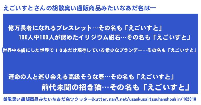 | 意味不明あだ名 | 『住所不定無職えごいすと(71歳)』 |