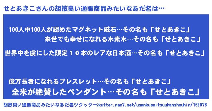 | 意味不明あだ名 | 『住所不定無職せとあきこ(47歳)』 |