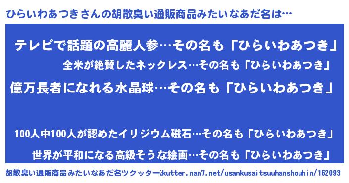 | 男性向けラノベタイトル風あだ名 | 『うちのひらいわあつきが世界を掌握している!』 |