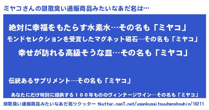 | 男性向けラノベタイトル風あだ名 | 『やはりミヤコの青春ラブコメはまちがっている 』 |