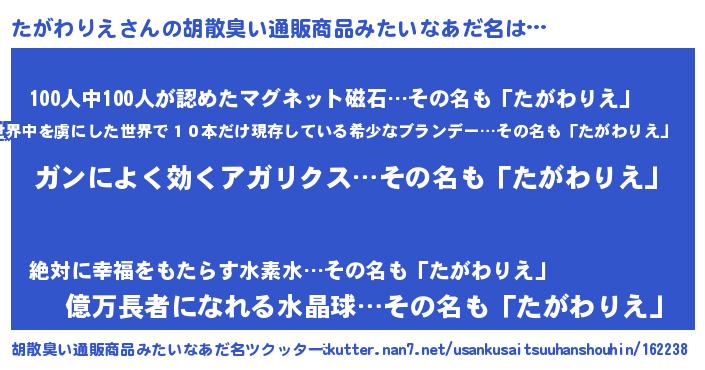 | ヘコむあだ名 | 『たがにゅー』『たがわりえ(笑)』 |